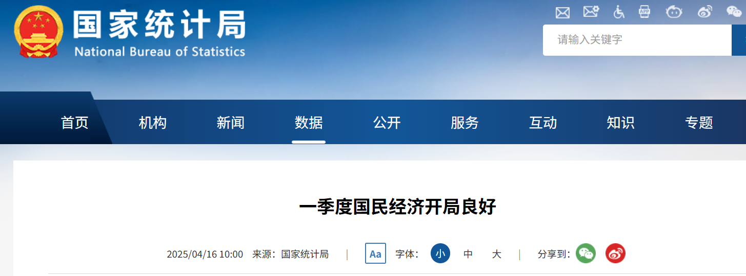 4月16日,国家统计局发布一季度中国经济数据。初步核算,一季度国内生产总值318758亿元,按不变价格计算,同比增长5.4%,比上年四季度环比增长1.2%。
