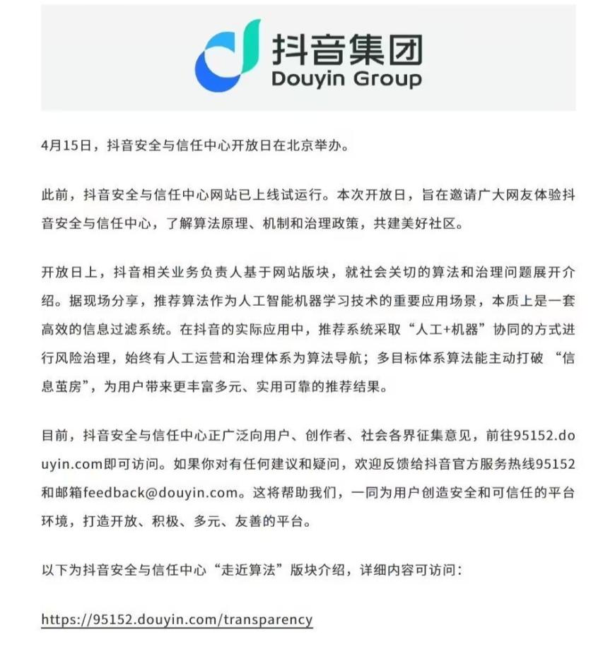 4月15日,抖音集团在北京举办“安全与信任中心开放日”,首次系统性披露其推荐算法原理及内容治理策略。据抖音业务负责人介绍,平台推荐算法基于人工智能机器学习技术构建,本质是一套动态优化的信息过滤系统。为平衡效率与安全,抖音采用“人工运营+机器审核”双轨制,由人工团队持续校准算法方向,避免单一技术主导引发的“信息茧房”效应。此外,多目标体系算法可综合用户兴趣、内容质量及社会价值等多维度参数,主动推送多元化内容。
