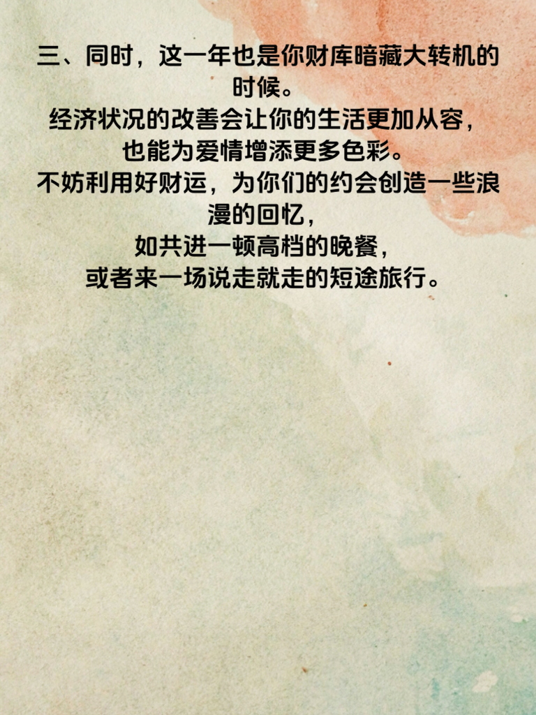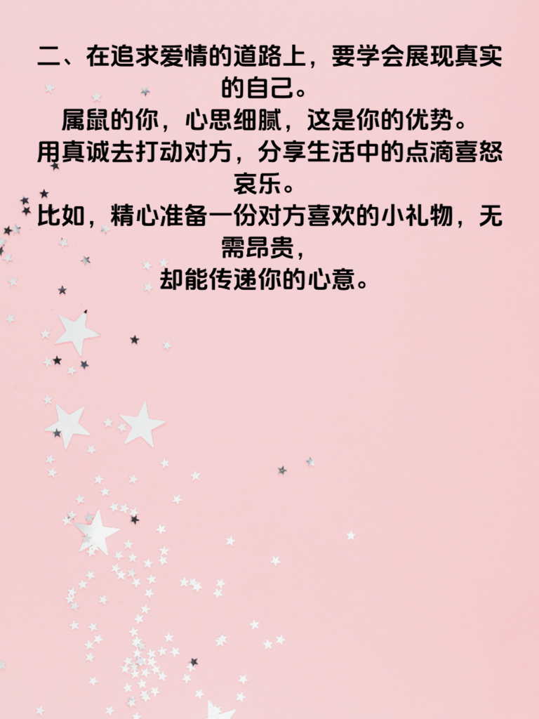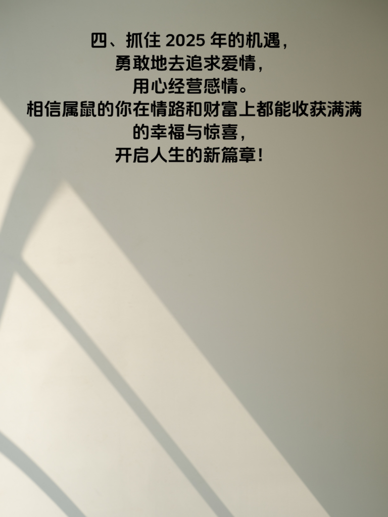 一、属鼠的朋友们,2025 年可是你们情路逆袭的关键一年!在这一年里,爱情运势如同璀璨星辰,为你照亮前行的方向。你会发现身边的缘分悄然增多,那个与你灵魂契合的人或许就在某个转角处等待着与你相遇。 二、在追求爱情的道路上,要学会展现真实的自己。属鼠的你心思细腻,这是你的优势。用真诚去打动对方,分享生活中的点滴喜怒哀乐。比如,精心准备一份对方喜欢的小礼物,无需昂贵,却能传递你的心意。 三、同时,这一年也是你财库暗藏大转机的时候。经济状况的改善会让你的生活更加从容,也能为爱情增添更多色彩。不妨利用好财运,为你们的约会创造一些浪漫的回忆,如共进一顿高档的晚餐,或者来一场说走就走的短途旅行。 四、抓住 2025 年的机遇,勇敢地去追求爱情,用心经营感情。相信属鼠的你在情路和财富上都能收获满满的幸福与惊喜,开启人生的新篇章!