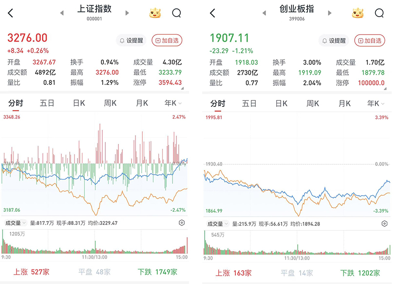 至收盘,沪指涨0.26%,报3276点;科创50指数涨0.81%,报1014.51点;深证成指跌0.85%,报9774.73点;创业板指跌1.21%,报1907.11点。