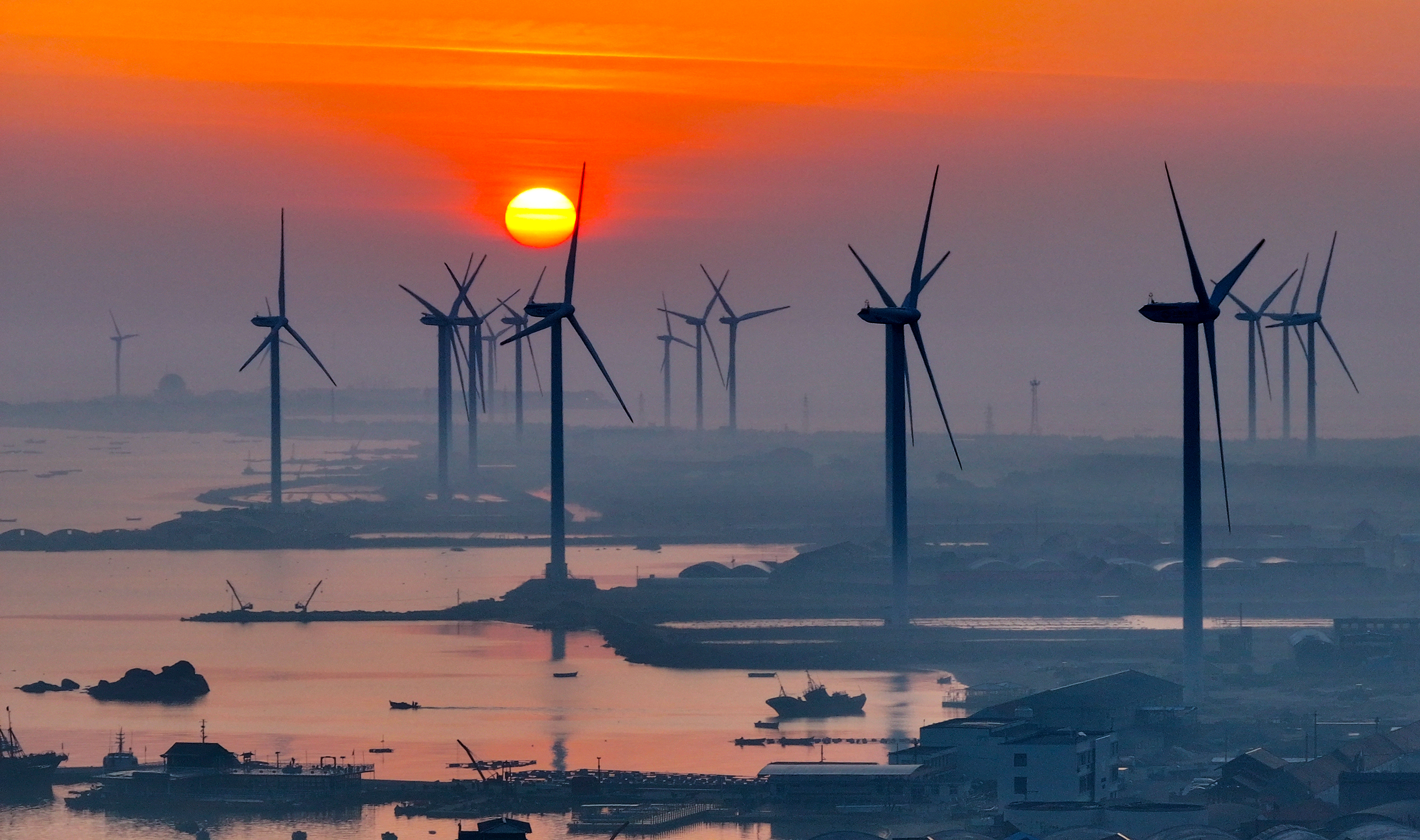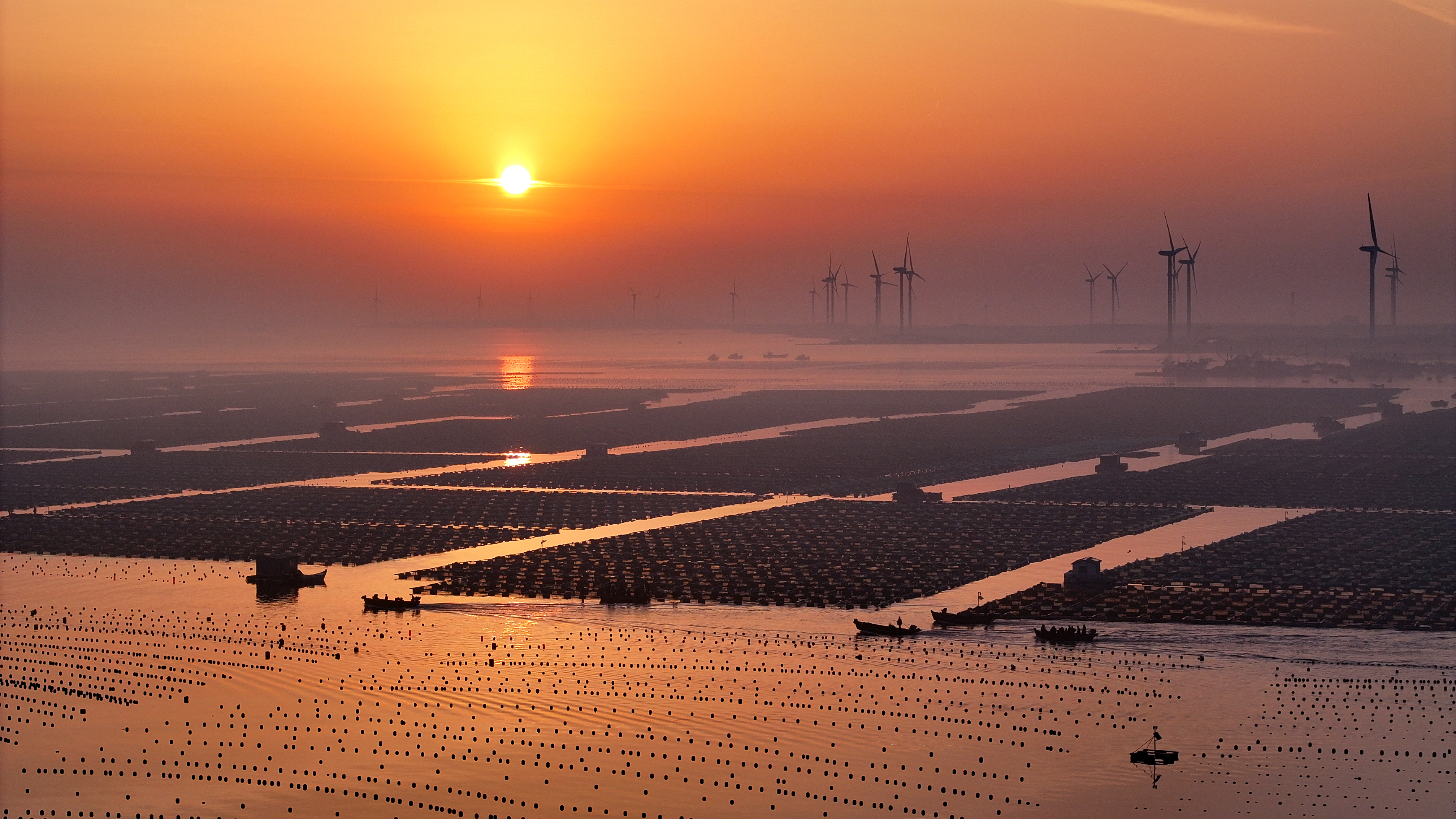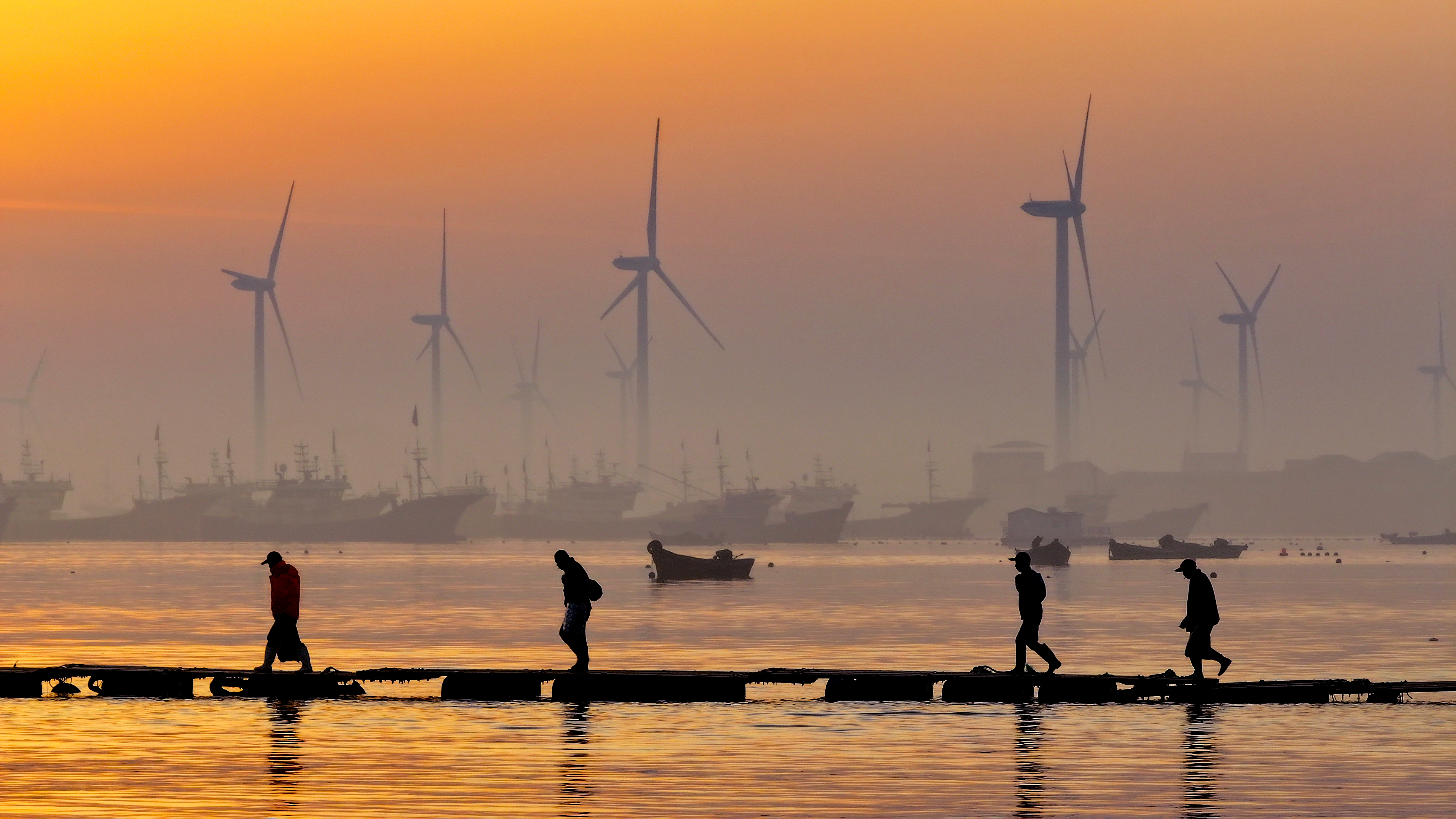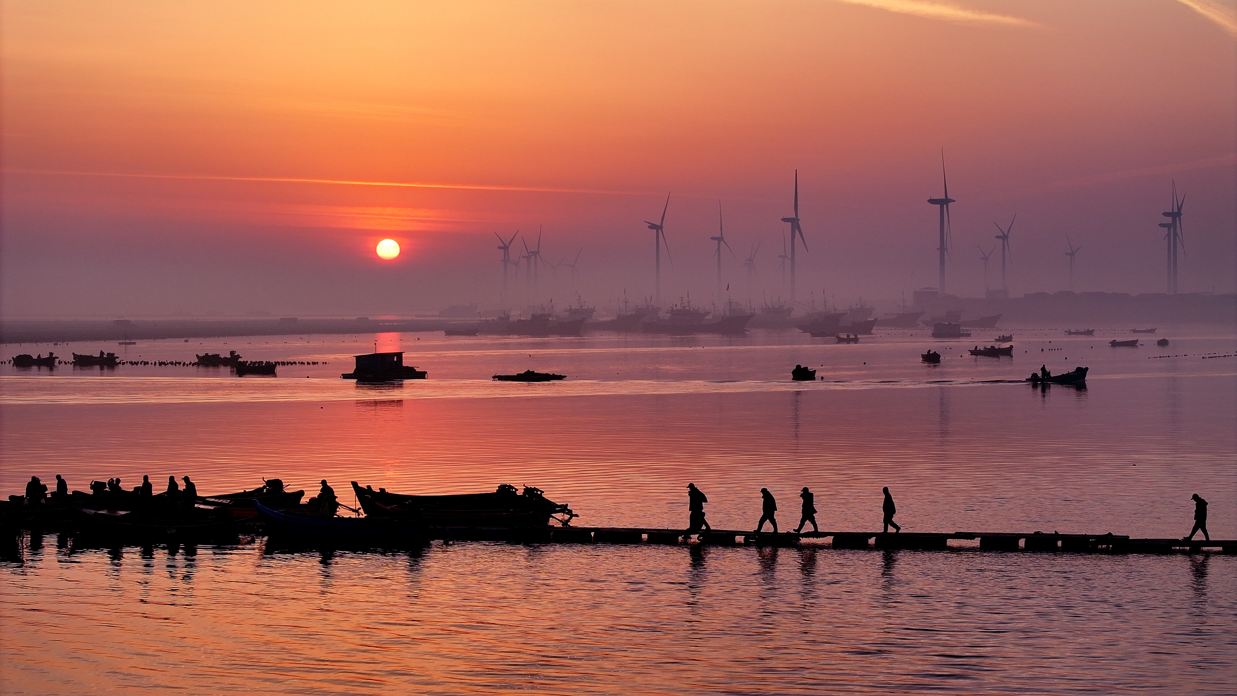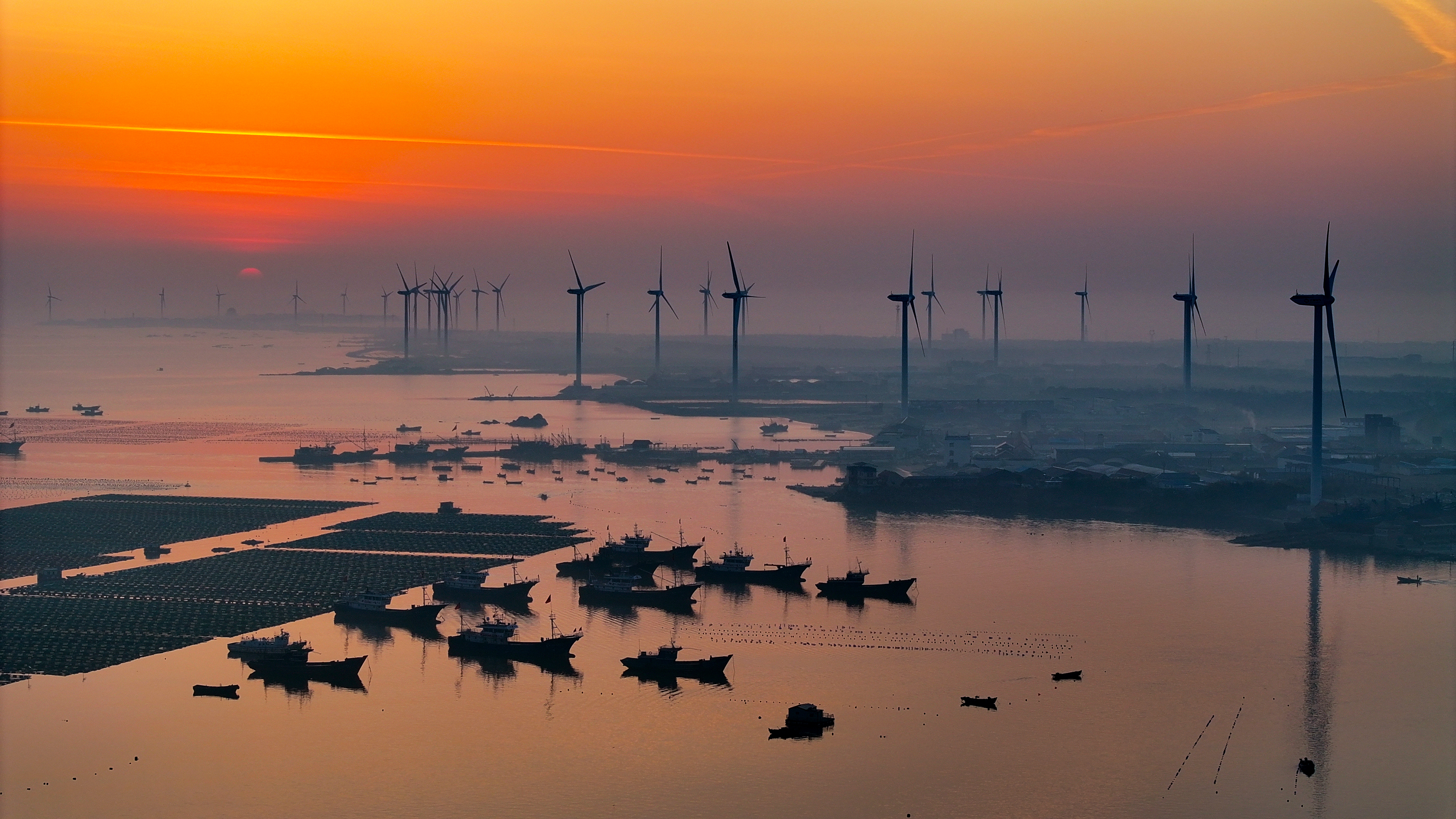 2025年4月16日,山东省荣成市石岛管理区桑沟湾海域,风电机组在平流雾中运转作业,渔民们驾驶船只迎着朝阳出海作业,构成一幅美丽的海洋牧场生态画卷。
