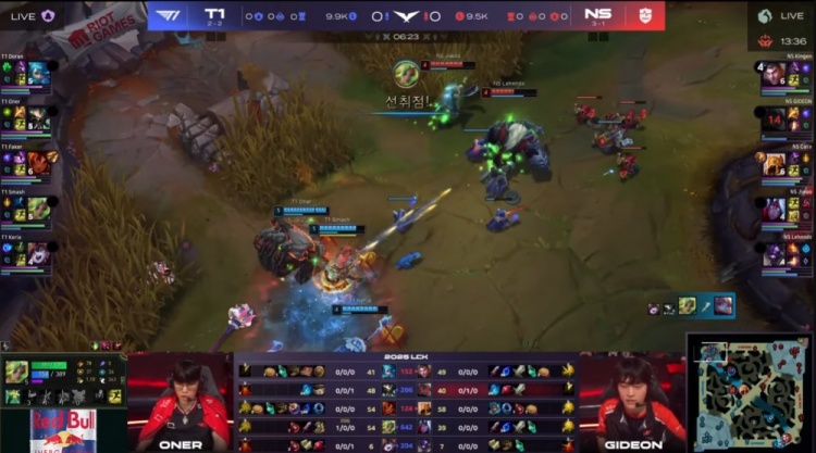 [28:06]野区团战,多兰野区一打二,Smash泽丽放电带走gideon,kingen杰斯收掉Oner蝎子后被Faker击杀,双方打出2换2,NS经济领先3k。