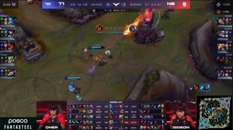 [18:25]Faker岩雀中路石子全中,配合Keria璐璐击杀没闪的Jiwoo韦鲁斯,随后Smash推掉NS下路一塔,双方经济差距不大。