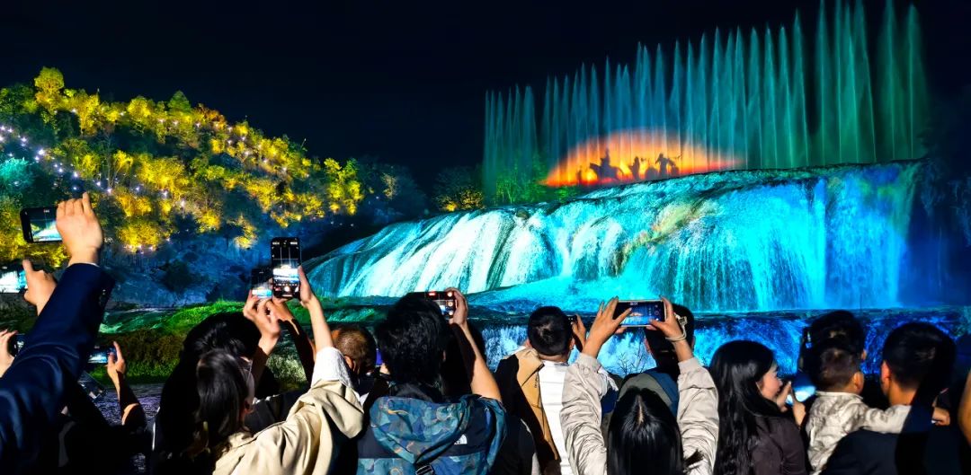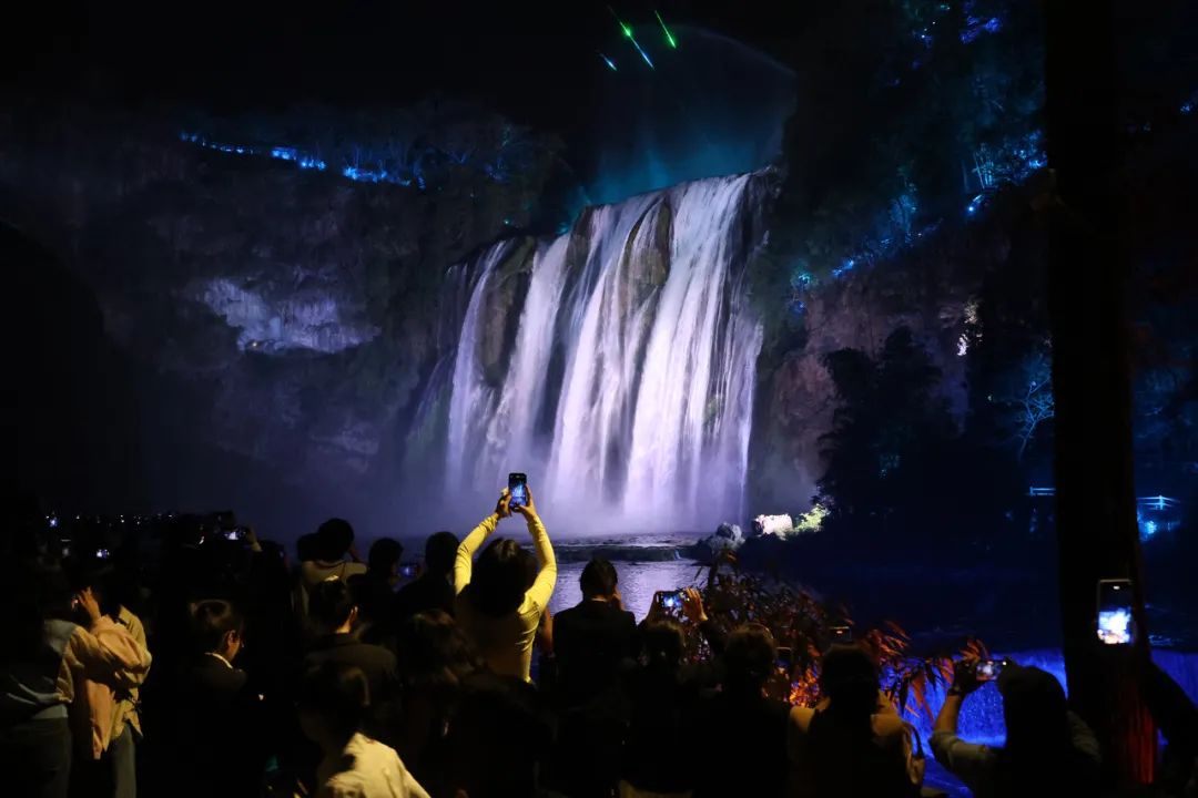 夜晚来临,黄果树瀑布褪去白天的喧嚣,展露出别样迷人的风姿。在黄果树景区,大型实景仙幻剧《敢问路在何方》精彩上演,光与影交织的视觉盛宴,搭配扣人心弦的剧情演绎,为与会嘉宾们开启一场夜游黄果树的奇妙光影之旅,现场掌声、欢呼声此起彼伏,连绵不绝。