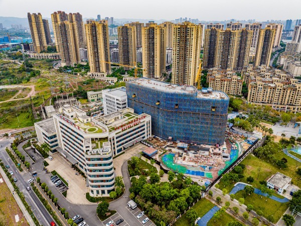 “项目主体结构已全面完成,目前我们正开展二次结构施工及装饰装修工作。”中建二局项目负责人白显军表示,自开工建设以来,在大渡口区政府及业主的协调支持下,项目团队克服了地质坚硬、雨季、高温等因素,工程整体进度正有序推进,将于今年年底全部竣工。