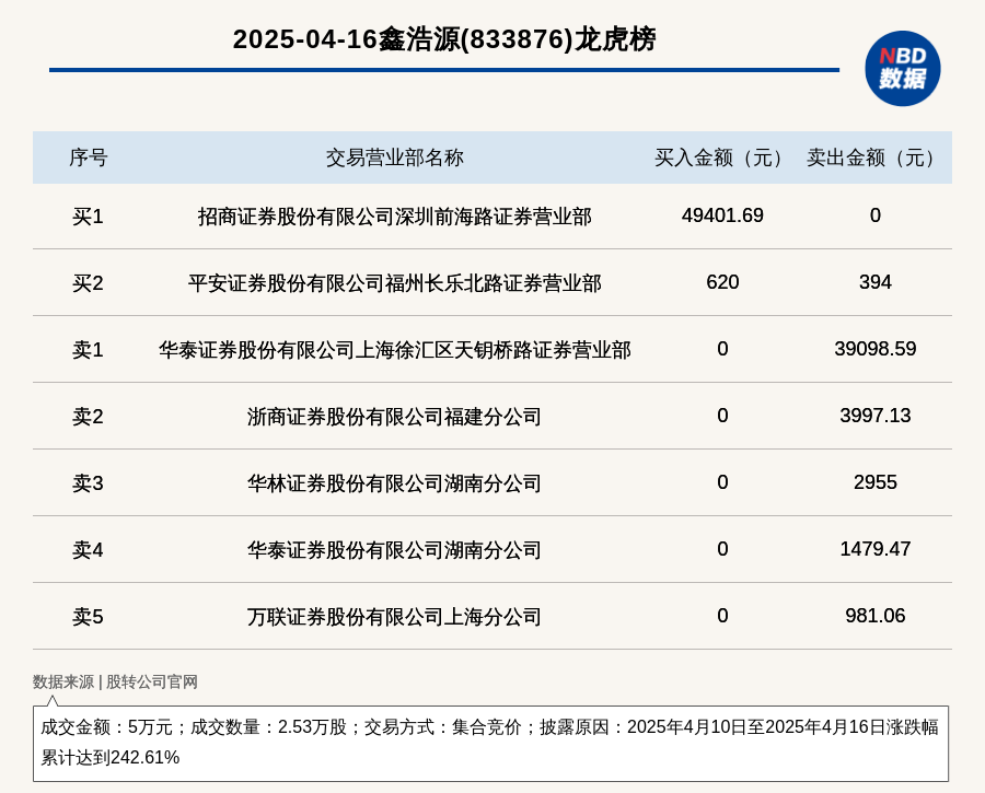 每经讯,2025年4月16日,新三板创新层公司鑫浩源(833876,收盘价:3.94元)登上龙虎榜,交易方式是集合竞价,披露原因是2025年4月10日至2025年4月16日涨跌幅累计达到242.61%,成交数量2.53万股,成交金额5万元。买一席位为招商证券股份有限公司深圳前海路证券营业部,买入4.94万元;卖一席位为华泰证券股份有限公司上海徐汇区天钥桥路证券营业部,卖出3.91万元。