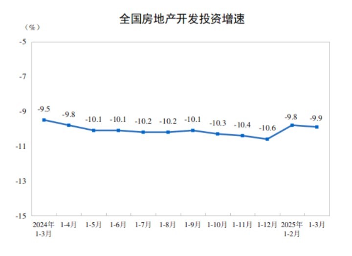国家统计局数据显示,1-3月份,全国房地产开发投资19904亿元,同比下降9.9%(按可比口径计算),降幅较上月扩大0.1个百分点;其中住宅投资15133亿元,下降9.0%。