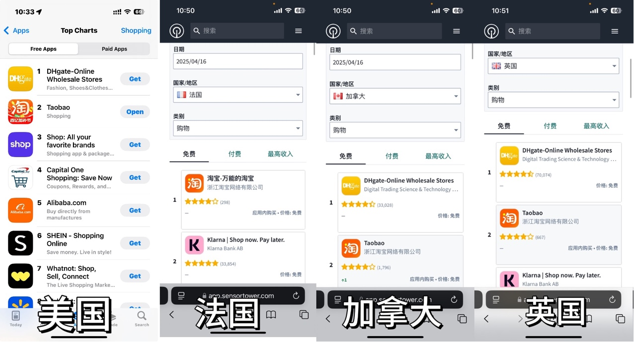就在4月16日,公开数据显示,淘宝已经冲上了美国App下载榜第二,同时在加拿大、英国等国家上升至第二,法国市场更是排名第一,下载量较“关税风波”前大幅上升。