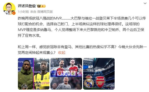 詹俊:昨晚两场欧冠八强战的MVP...........大巴黎与维拉一战登贝莱下半场浪费几个可以传球打配合的机会,选择自己射门,上半场类似这样的球处理得很好。这场球的MVP理应是多纳鲁马,个人觉得整场下来大巴黎就他和中卫帕乔、两个边后卫保持了应有水准。