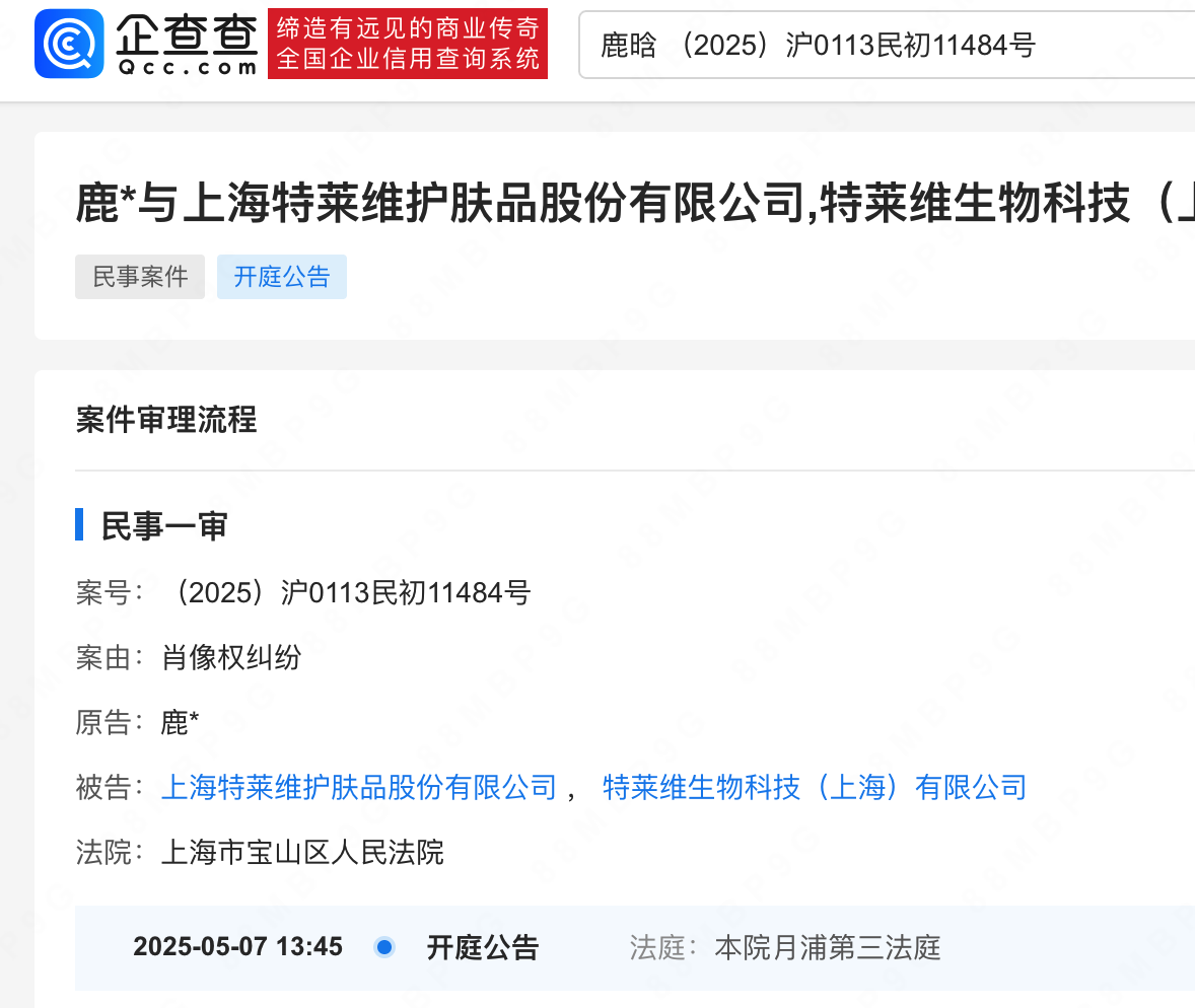 企查查APP显示,法院公开鹿晗与上海特莱维护肤品股份有限公司等肖像权纠纷开庭公告,将于5月7日在上海市宝山区人民法院开庭审理。