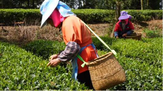 在旧州镇海马村的茶山上,贵州嘉合轩农业产业发展有限责任公司的450余亩梯田式茶园顺着山势蜿蜒铺展。茶山上,茶树吐露的新芽鲜嫩欲滴,一簇簇、一垄垄茶树郁郁葱葱,生机盎然。茶垄间,采茶的村民们头戴帽子,身挎竹篓,手指在茶树间翻飞,一掐一提,鲜嫩的茶叶便落入篓中,动作娴熟而高效。