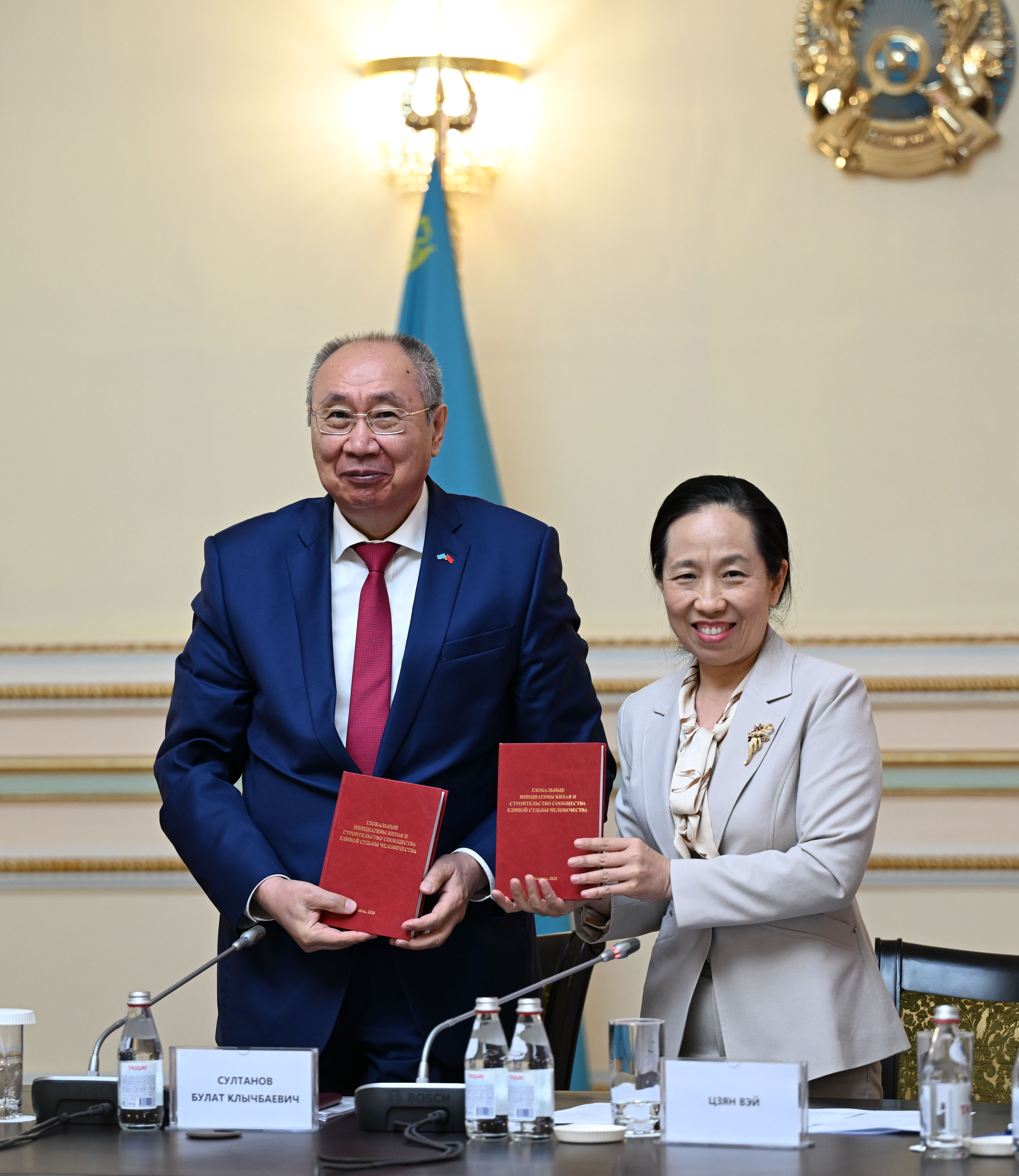 4月16日,在哈萨克斯坦阿拉木图,哈萨克斯坦“一带一路”专家俱乐部主席苏丹诺夫(左)与中国驻阿拉木图总领事蒋薇在红厅论坛《全球三大倡议与构建人类命运共同体》文集发布环节合影。