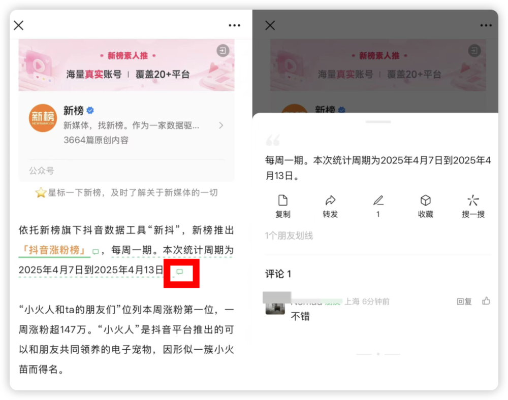 这是微信对于提高内容互动的一次新尝试,有点像图文版本的“弹幕”。