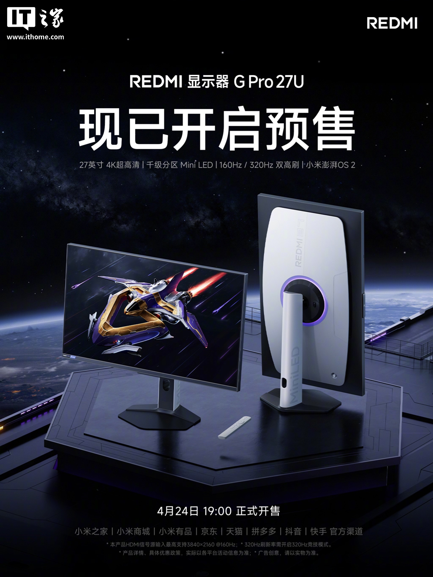 IT之家4月17日消息,REDMI显示器#GPro27U现已开启预售,支持4K160Hz/1080P320Hz双高刷显示、1152分区MiniLED精准控光、搭载小米澎湃OS2,将于4月24日19:00开售(售价暂未公布)。