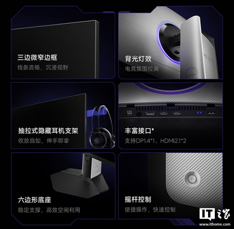 显示器采用三边微窄边框设计,后置背光灯效,拥有抽拉式隐藏耳机支架,提供DP1.4、HDMI2.1接口。显示器还配备六边形底座,支持摇杆控制。