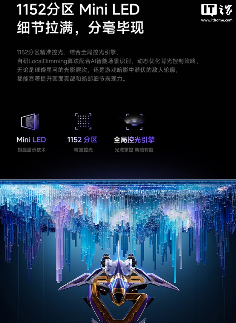 新款显示器搭载1152分区MiniLED屏幕,峰值亮度1600nits,支持HDR1000、杜比视界。显示器内置自研LocalDimming算法+AI智能场景识别,支持动态优化背光控制策略(配备4档控光模式)。