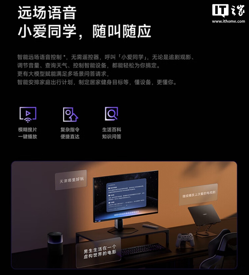 显示器自带双扬声器立体声(2*5W高保真扬声器),预装澎湃HyperOS2系统(支持一键遥控变身电视)。显示器还支持远场语音控制,可直接呼喊小爱同学。