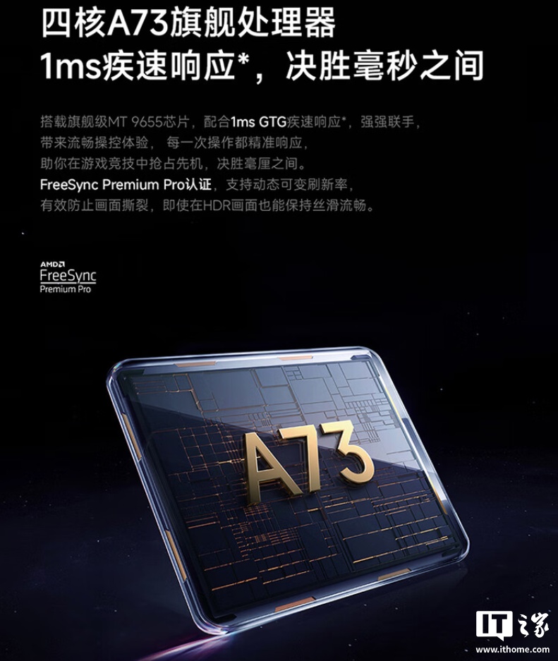 据介绍,小米REDMI显示器GPro27U搭载旗舰级MT9655芯片,支持1msGTG响应。显示器还通过FreeSyncPremiumPro认证,支持动态可变刷新率。