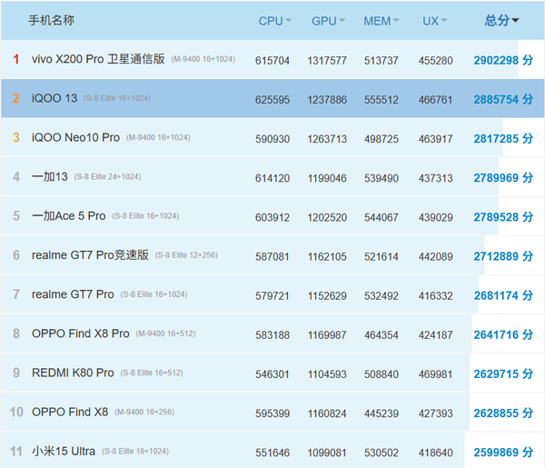 作为参考,安兔兔官网显示,目前综合性能最强的手机为vivoX200Pro卫星通信版,搭载联发科天玑9400处理器,提供16GB运行内存和1TB机身存储,安兔兔综合跑分超过290万分。而其他天玑9400机型,如iQOONeo10Pro、OPPOFindX8Pro、OPPOFindX8、vivoX200、vivoX200Promini的跑分大致在240万至285万左右。此外,高通骁龙8至尊版机型跑分大致在230万至288万分左右。