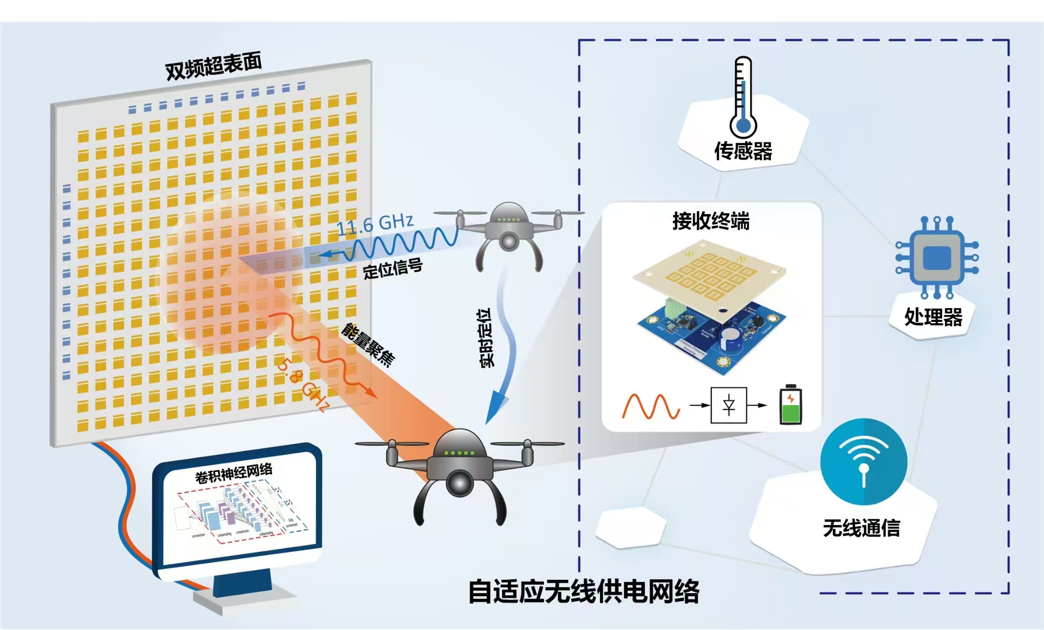 实现无人机“边飞边充电”,精准定位移动中的无人机,并能高效精准地传递能量是关键。简单来说,基于电磁超表面的辐射式无线能量传输与接收技术宛如“智慧大脑”,能通过目标感知和环境交互,智能化调整电磁波传输参数,包括对电磁波不同幅度、相位、辐射方向的灵活控制,并根据周围环境变化及设备实时需求,提高无线能量传输效率,精准且高效地为设备输送能量,最终实现类似于雷达的波束扫描、跟踪和探测效果。