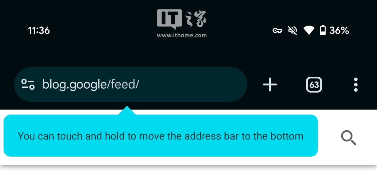 IT之家4月17日消息,根据外媒9To5Google报道,部分稳定版的用户在将Chrome浏览器更新到最新版后,收到了“可长按地址栏,移动到屏幕底部”的提示。