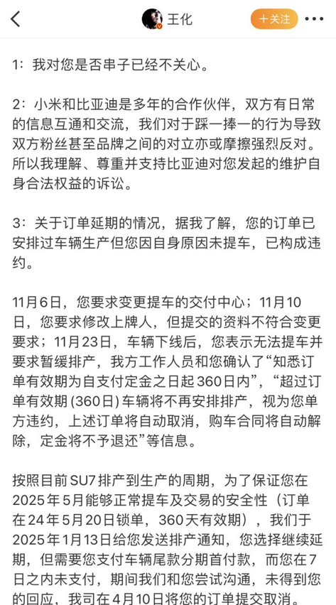 后续,王化回应称徐里里订单违约系自身原因导致。具体来看,2024年11月,徐里里陆续变更交付中心、修改上牌人信息(资料不符合要求),车辆下线后徐里里要求暂缓排产。再后来,工作人员与徐里里确认了“知悉订单有效期为自支付定金之日起360日内”,“超过订单有效期(360日)车辆将不再安排排产,视为您单方违约,上述订单将自动取消,购车合同将自动解除,定金将不予退还”等信息后,徐里里选择延期。因此,小米按照目前SU7排产到生产的周期,为了保证徐里里在2025年5月能够正常提车及交易的安全性(订单在2024年5月20日锁单,360天有效期),小米于2025年1月13日给徐里里发送排产通知,徐里里继续选择延期,但并未在7日内支付车辆尾款分期首付款,期间沟通未得到回应,最终在4月10日,订单被取消。