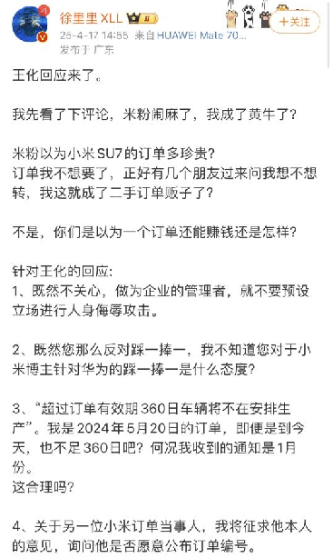 近日,小米集团公关部总经理王化与汽车领域博主@徐里里关于“小米SU7订单尾款支付流程”的争议引发关注,双方就消费者权益保障、交易安全性等核心问题展开多轮讨论。