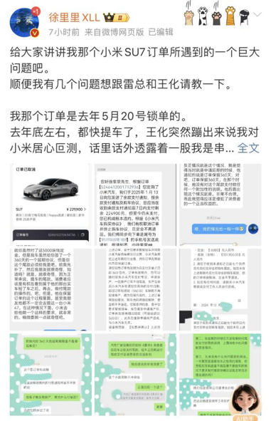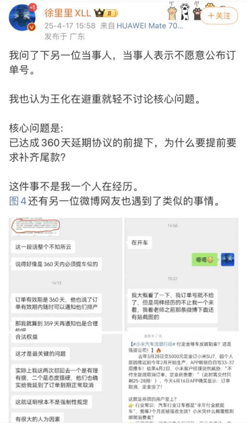 4月17日,徐里里发微博称自己在2024年5月20日锁单小米SU7,后在同年年底因配置调整主动取消并重新锁单。小米客服告知其可申请360天延期,随后在2025年1月要求徐里里一周内支付尾款,否则订单作废,徐里里未理会。2025年4月10日,小米客服正式通知其订单作废,定金不退。同时,徐里里在博文中提到另一位用户同样遭遇类似情况。由此,徐里里质疑小米360天的延期时间在还不到150天就取消订单的合理性,且延期期间未提前说明需短期内补款。