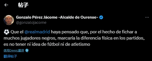他在社媒上写到:皇马以为签下大量黑人球员就能在比赛中带来身体上的优势,这是不懂足球和田径的表现。