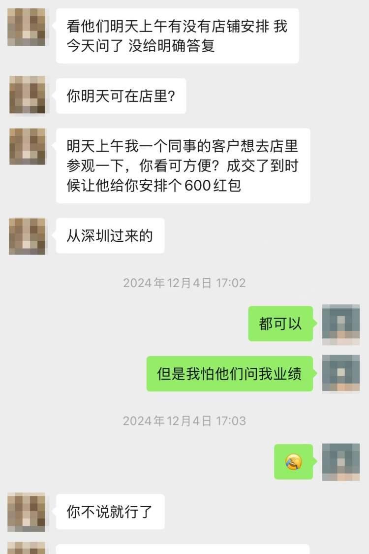 一个微信名叫何X正的加盟者收到运营销售的微信:“明天上午我一个同事的客户想去店里参观一下,你看可方便?成交了到时候让他给你安排个600元红包。”