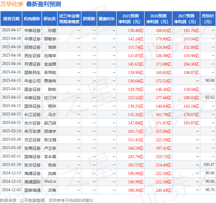最新盈利预测明细如下: