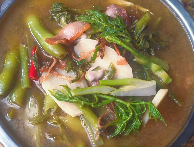 干腌菜蚕豆椿头汤,则是时光沉淀的温柔。将焯过水的椿头进冷水一激,锅中腊肉煸油为引,椿头里加入新鲜蚕豆和洋芋,共赴一锅慢火熬煮。干腌菜等佐料在出锅前3分钟也悉数加入。最终,陈年腌菜的酸醇、蚕豆的绵糯,勾出椿芽的清润,汤色浑黄中浮着翠绿,舀一勺,是对山民劳作后的馈赠,也是枯荣交替里,人对土地的深情,对生活、对自然深深的热爱和尊重。