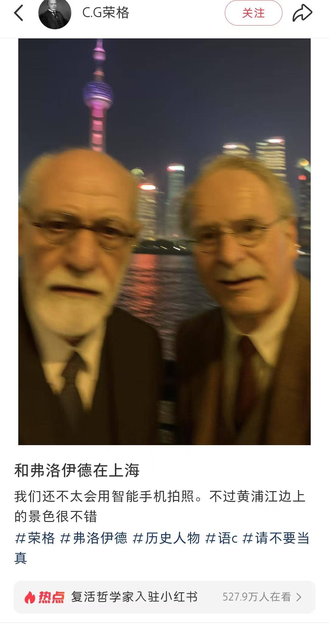 4月18日,“复活哲学家入驻小红书”登上站内热搜,“我是黑格尔,今天正式入驻小红书,听说你们读不懂我的著作,请将阅读中的问题留在评论区。”“我是雅克·拉康,我从语言学出发重新解读弗洛伊德。”“大家好我是弗洛伊德,在小红书看到了很多人对我的理论的解读和支持,谢谢各位!”这些个人账号顶着著名哲学家的名字和照片、肖像画,用第一人称发帖交流,像是和网友们玩起了角色扮演。