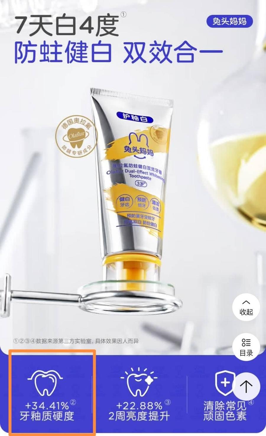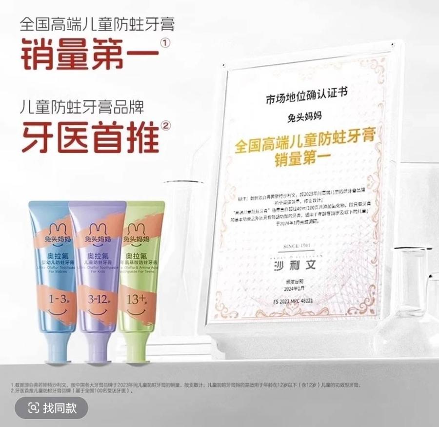 2024年,《消费日报》《极目新闻》曾报道,“兔头妈妈”的主播宣称,普通氟只能保护刷到的地方,而奥拉氟可以保护周遭的牙“邻居”,包括小朋友没有刷到的缝隙和角落,“哪怕宝宝刷不干净,依旧可以有效防蛀牙”。