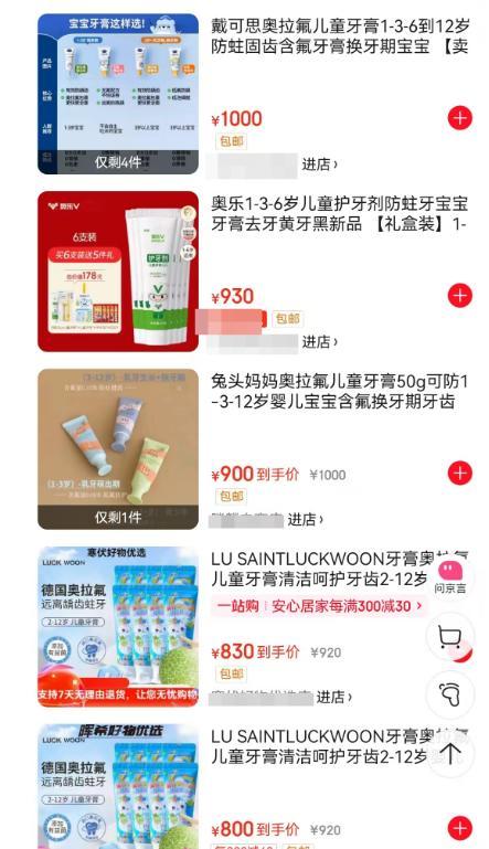 某电商平台显示,数十款主打奥拉氟成分的儿童牙膏中,单支价格从9.9元到1000元不等。