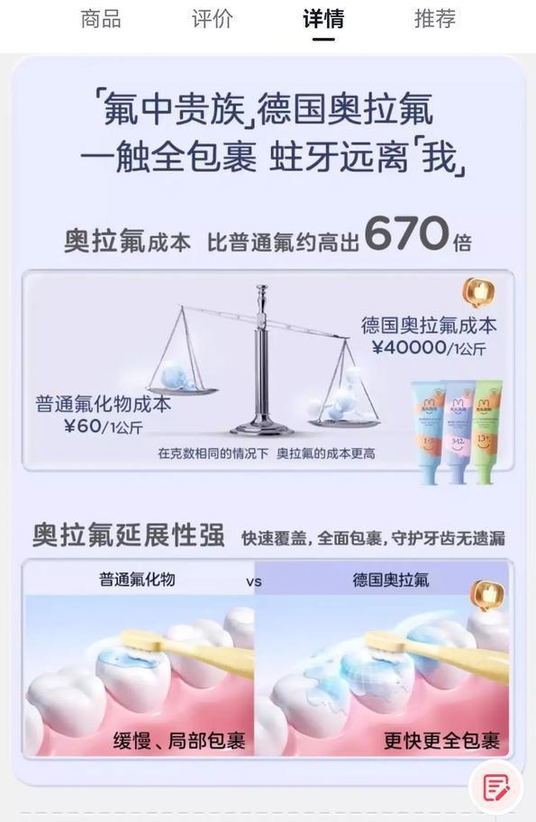 “一会儿说原材料是每公斤4万元的德国奥拉氟,一会儿说使用后牙釉质硬度提升30%,一会儿又提升60%,甚至还有提升104%的……”近日,宝妈李女士在社交平台发帖“吐槽”称,孩子即将到换牙期,为防孩子蛀牙,在电商平台选择儿童牙膏时,“被各种关于奥拉氟牙膏的神化宣传弄懵了。”