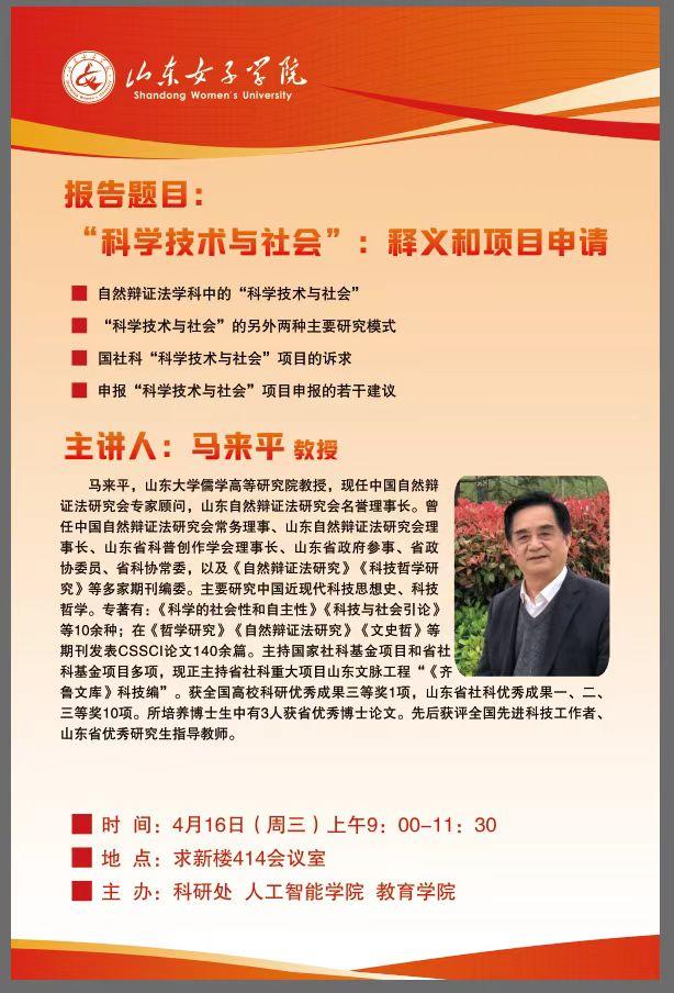 今年全国社科基金项目增列了新的研究领域“科学技术与社会”,出乎许多人的意料,也引发了诸多疑问。例如,什么是“科学技术与社会”?它是怎样的一个研究领域?全国社科基金项目为什么要增列这个研究领域?申报这个研究领域的项目需要注意些什么?为了解答这些问题,助力2025年度国家社科基金项目申报工作,4月11日下午和16日上午,中国自然辩证法研究会专家顾问、山东自然辩证法研究会名誉理事长、山东大学儒学高等研究院马来平教授应邀相继莅临山东建筑大学和山东女子学院作学术报告。