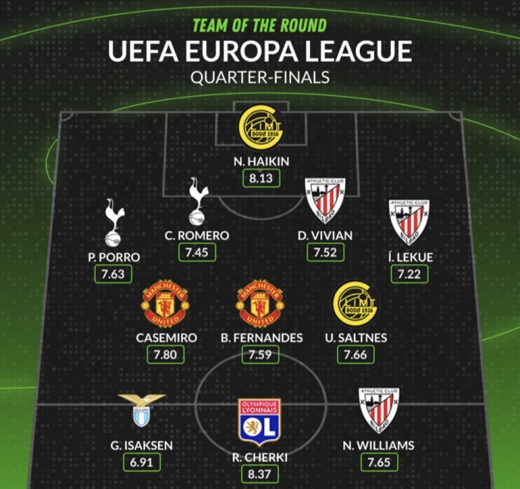 直播吧4月18日讯欧联杯1/4决赛次回合比赛全部战罢,数据网站Whoscored盘点了本轮比赛评分最高阵容,其中切尔基领衔锋线、B费、卡塞米罗在列,具体如下: