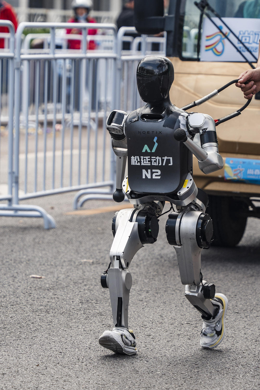 ▲4月19日,全球首个人形机器人半程马拉松鸣枪开跑,松延动力N2机器人夺得亚军。图据视觉中国