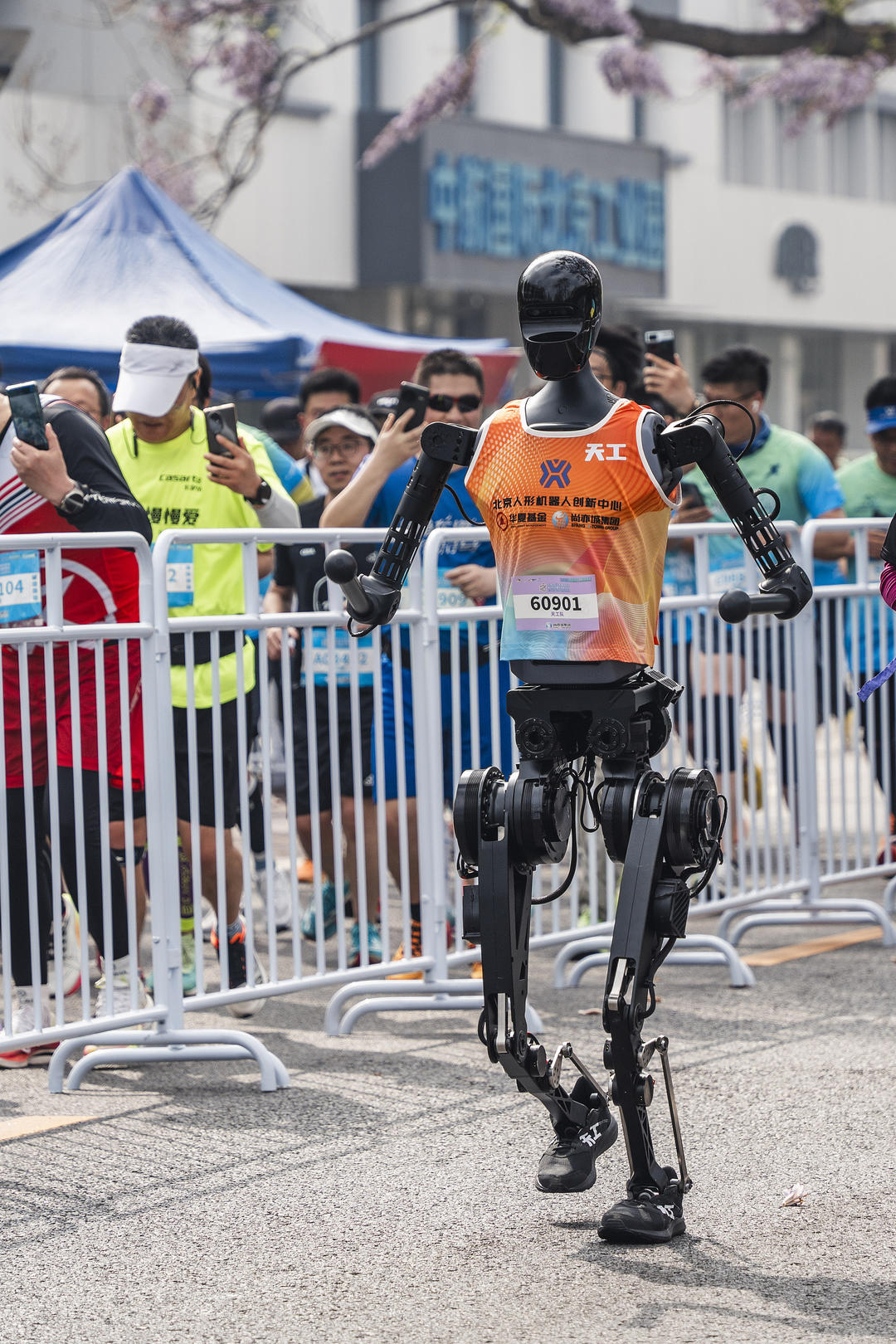 ▲4月19日,全球首个人形机器人半程马拉松鸣枪开跑,“天工”机器人夺得冠军。图据视觉中国