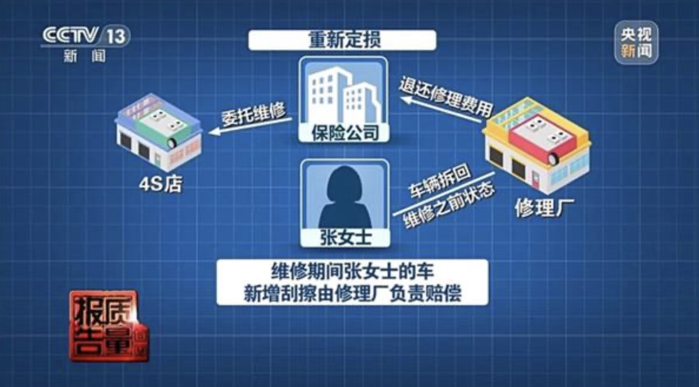 原本是一件极平常的事故车理赔维修事件,没想到20多天后,张女士发现维修后的汽车大灯、门子、引擎盖等均使用拆车旧件,而且后视镜、车窗膜、门把手等处新增了多处刮痕。
