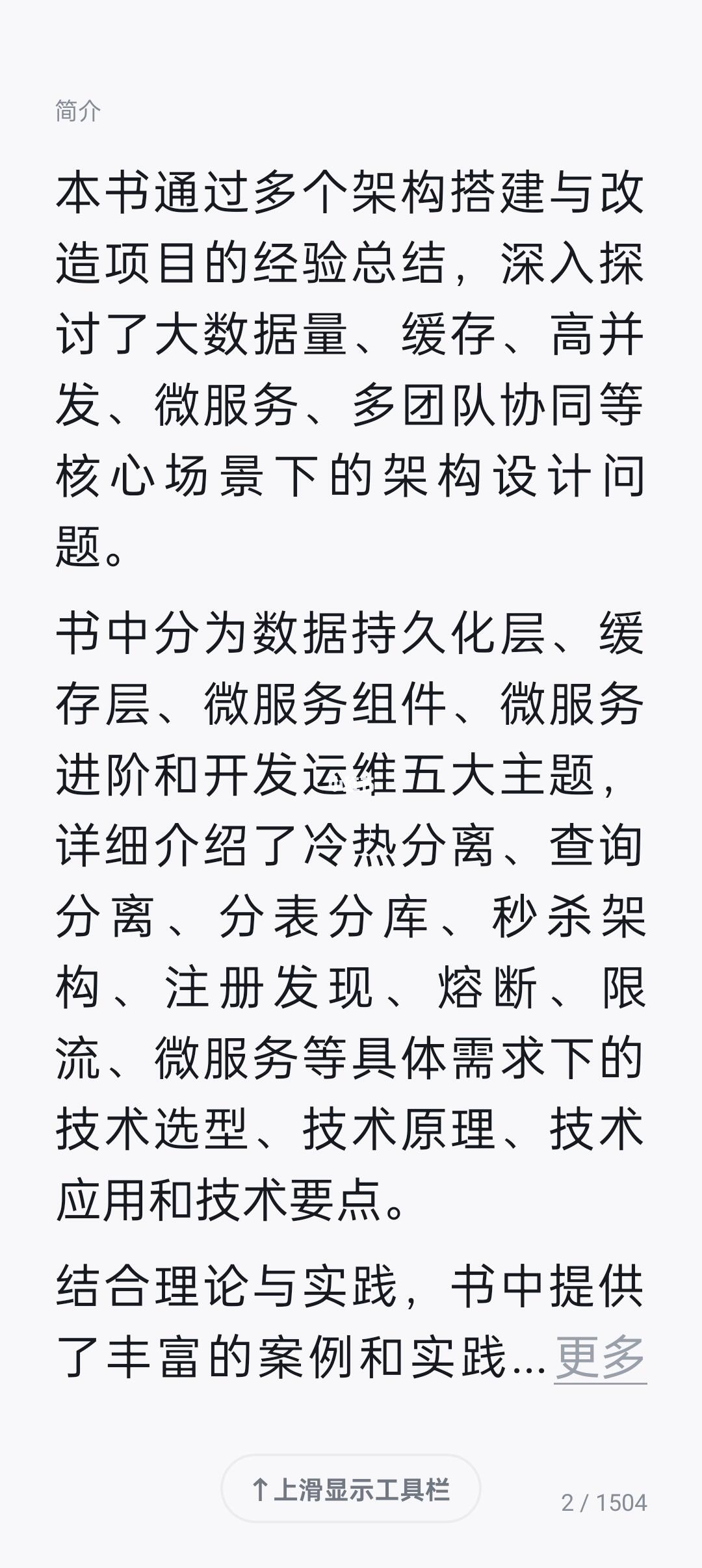 基于对十余个架构搭建与改造项目的经验总结,介绍了大数据量、缓存、高并发、微服务、多团队协同等核心场景下的架构设计常见问题及其通用技术方案,包含冷热分离、查询分离、分表分库、秒杀架构、注册发现、熔断、限流、微服务等具体需求下的技术选型、技术原理、技术应用、技术要点等内容,将技术讲解与实际场景相结合,内容丰富,实战性强,易于阅读。