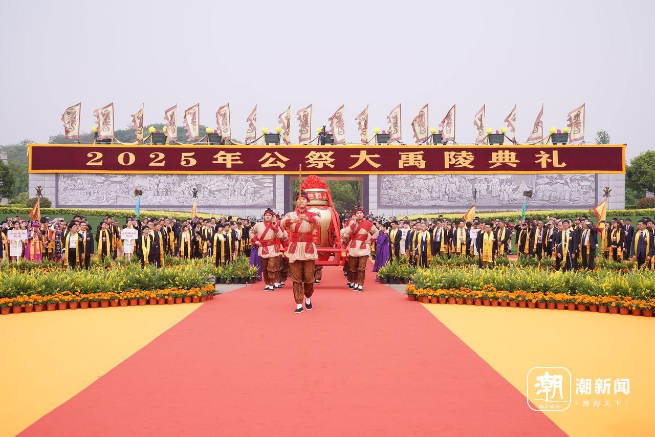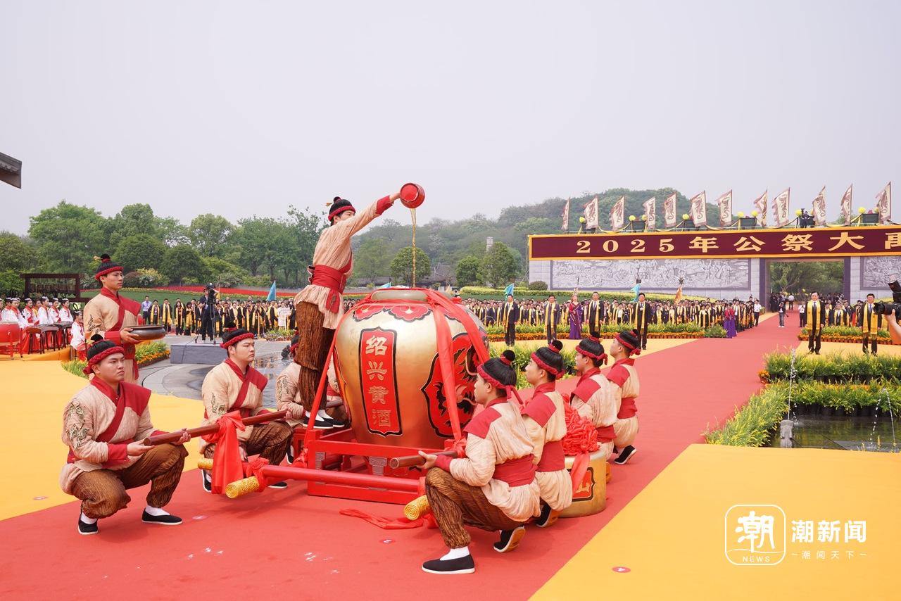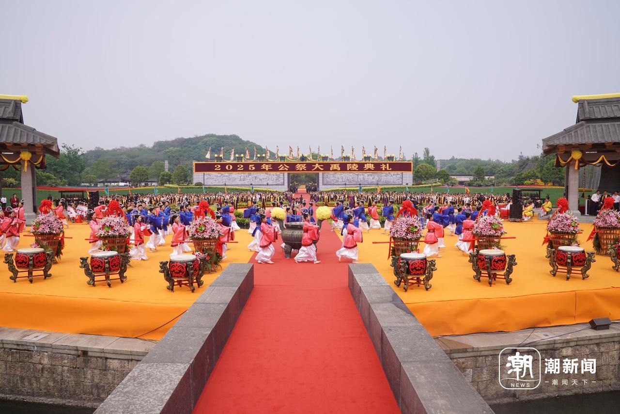 4月20日上午,2025年公祭大禹陵典礼在绍兴大禹陵祭祀广场隆重举行。典礼以最高祭祀礼仪“禘礼”举行。今年的典礼有13项仪程,分别为肃立雅静、鸣号、敬献花篮、敬香、击鼓