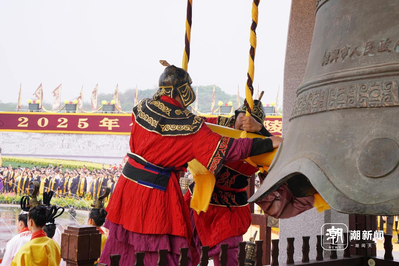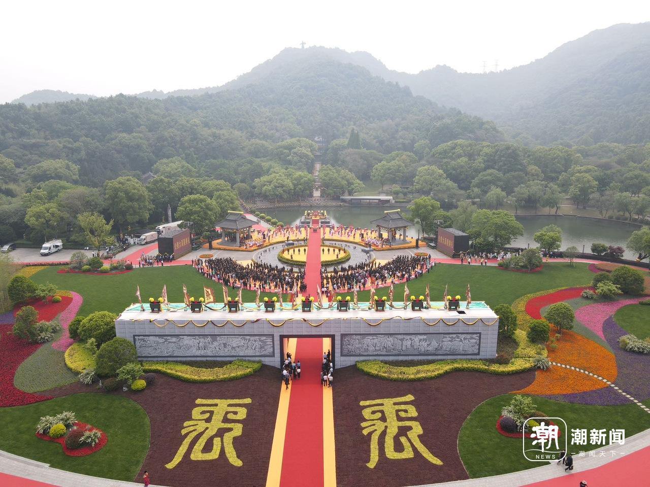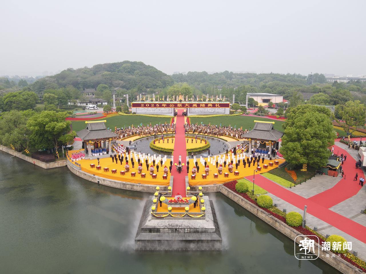 4月20日上午,2025年公祭大禹陵典礼在绍兴大禹陵祭祀广场隆重举行。典礼以最高祭祀礼仪“禘礼”举行。今年的典礼有13项仪程,分别为肃立雅静、鸣号、敬献花篮、敬香、击鼓