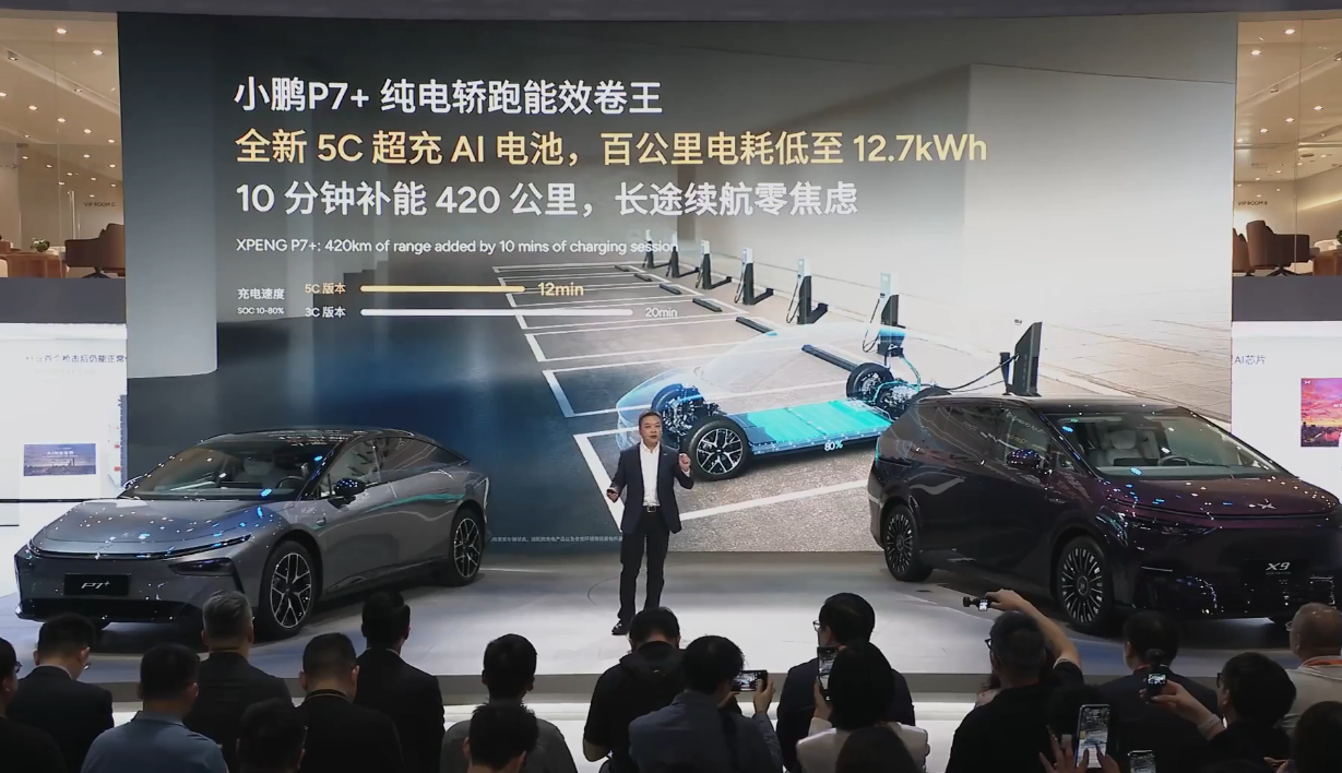 何小鹏透露,小鹏P7+的燃油置换车主特别多,每卖出三台就有一台是燃油车主置换。全新的5C超充版本支持10分钟补能420公里,百公里电耗低至12.7kWh。