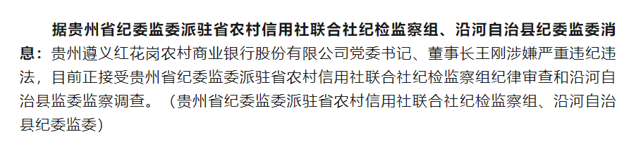 贵州遵义红花岗农村商业银行股份有限公司党委书记、董事长王刚涉嫌严重违纪违法,目前正接受贵州省纪委监委派驻省农村信用社联合社纪检监察组纪律审查和沿河自治县监委监察调查。