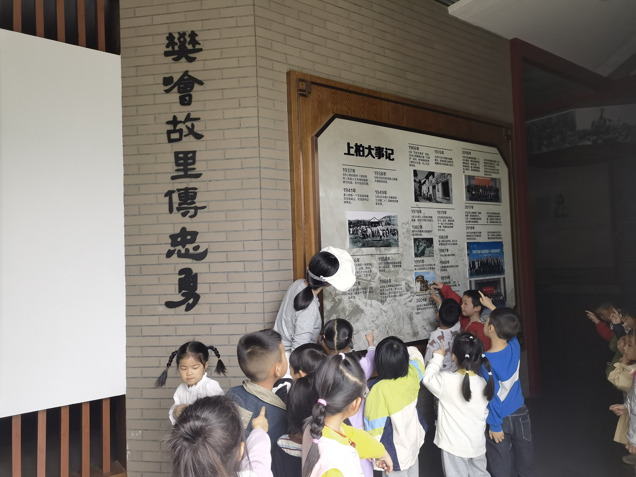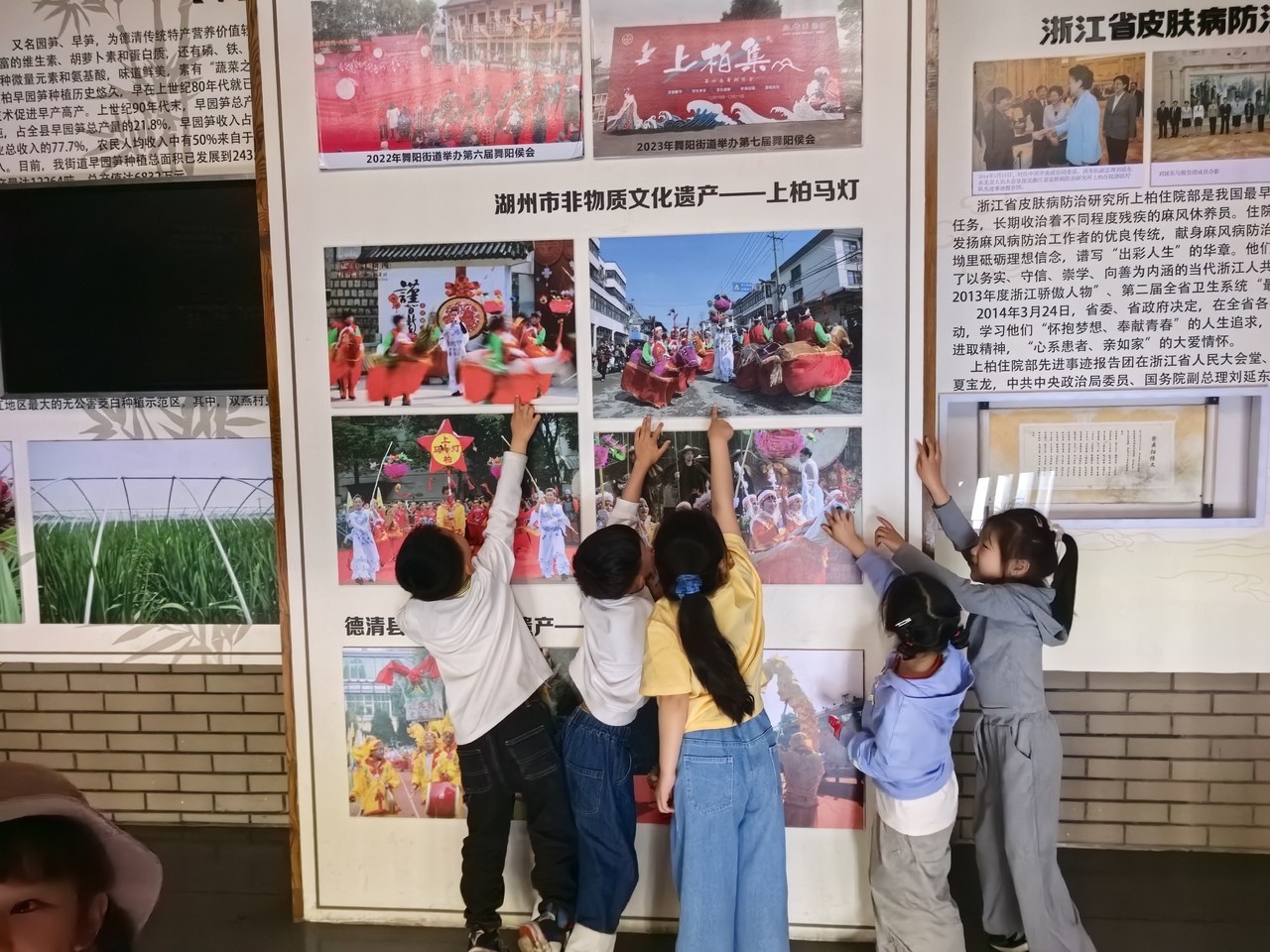 中、大班幼儿则背上小水壶,戴上遮阳帽,开启了“大庙山春日探险”之旅。徒步途中,孩子们在老师引导下观察山间植被的变化:蕨类植物蜷曲的嫩叶、松树下新生的野草莓、石缝中顽强生长的蒲公英……“原来石头缝里也能开花呀!”孩子们惊叹于生命的坚韧,纷纷用画板记录下眼中的春景。登山途中,教师还穿插了“自然拼图”“昆虫旅馆观察”等趣味任务,让徒步变成了一场生动的户外课堂。随后在教师的带领下孩子们还参观了大庙山文化馆,了解了上柏的发展历程,了解自己家乡的变化。