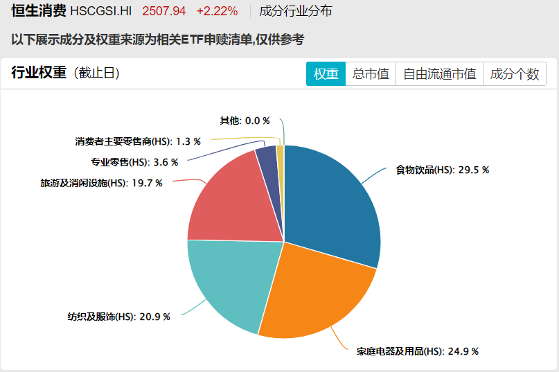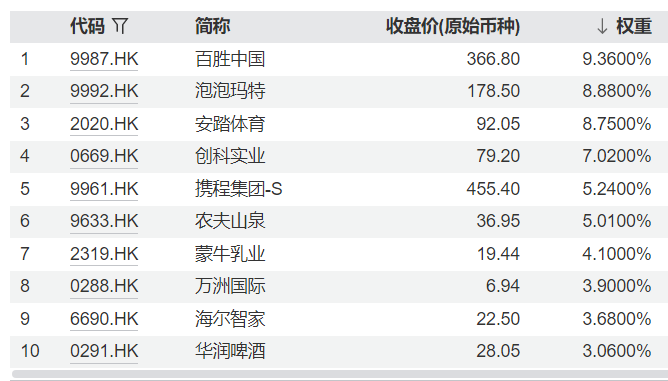而恒生消费指数的前十大权重公司,主要是百胜中国、泡泡玛特、安踏体育、携程集团-S、农夫山泉等涉及吃、穿、行的公司。