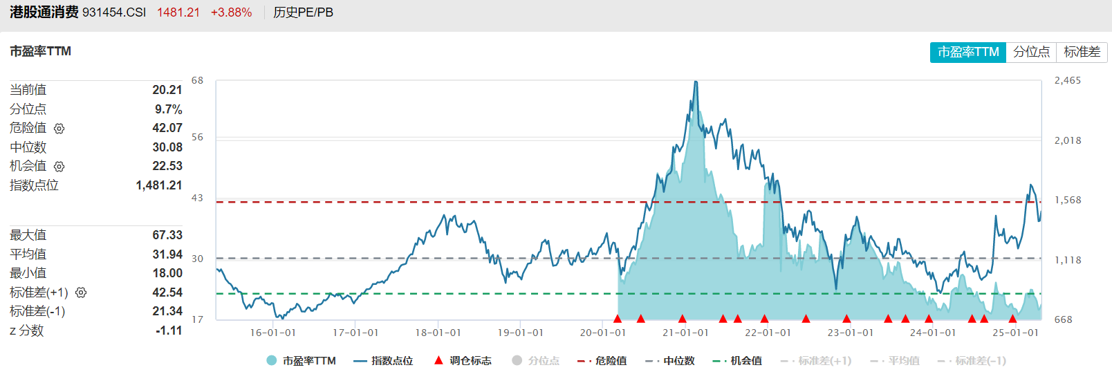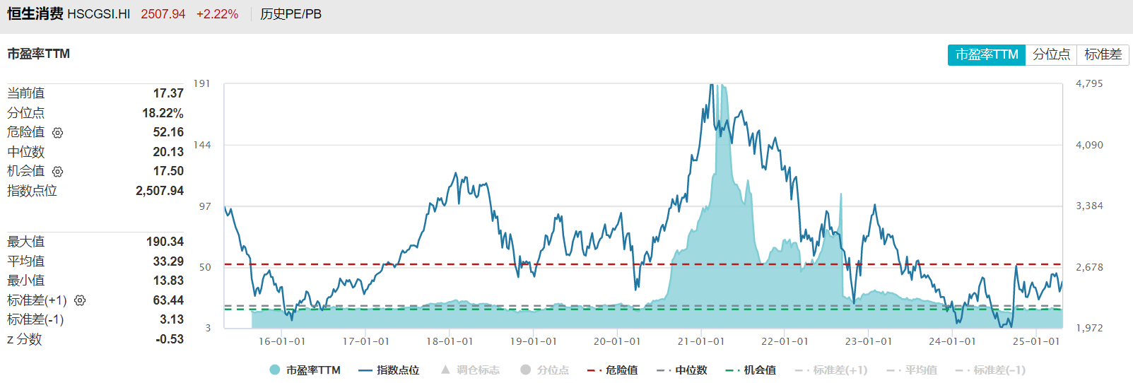 从目前的估值水平来看,wind数据显示,中证港股通消费主题指数目前的市盈率TTM处在历史10%分位以下,还属于非常低的位置。